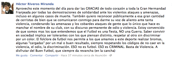 Luego expresó: ¨Estoy convencido de que somos más los que entendemos que el Fútbol es una fiesta, NO una Guerra. Saber convivir en sociedad implica ser tolerantes con los que piensan distinto, respetar al otro sin discriminar por un color¨.