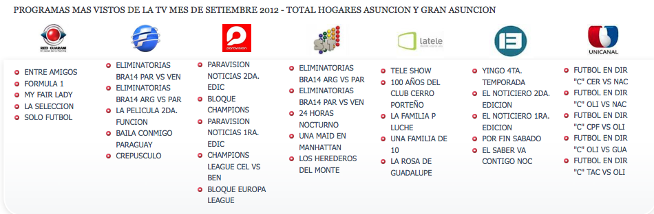 Muchos se preguntan quién están liderando la audiencia en la tv nacional. Según pudimos ver en el ranking de los programas más vistos del mes de Setiembre de la firma Ibope, los partidos de eliminatorias fueron de lo más sintonizado en dicho mes. En Telefuturo llama la atención que Baila Conmigo esté detrás de La Película Segunda función y la ausencia más notoria es Rojo. ¿Qué pasará?